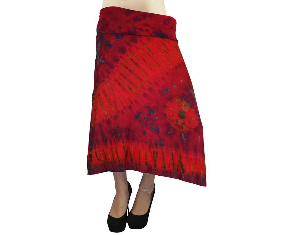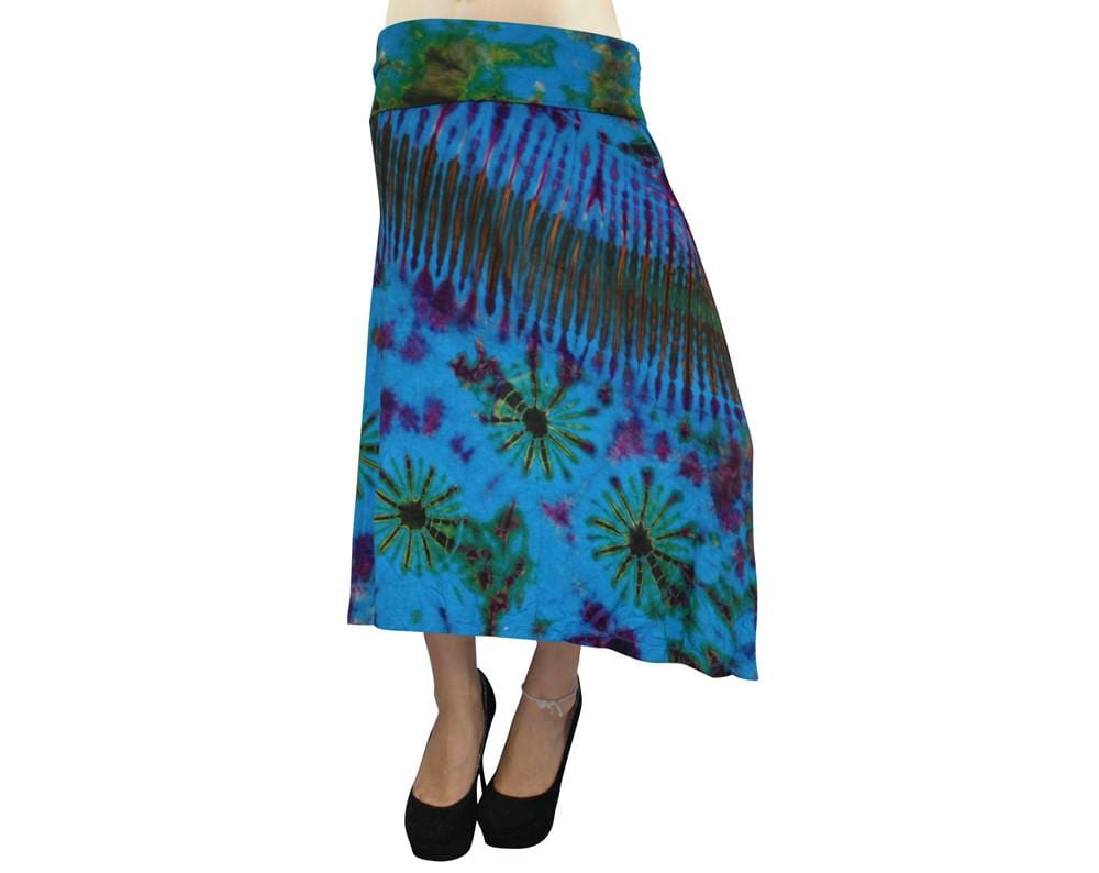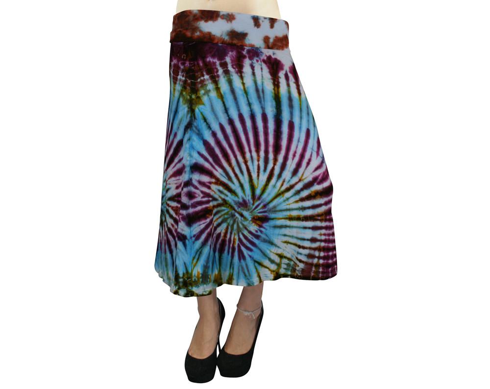 These colorful tie dyed long length “yoga skirts” with foldover hem are a best-selling ladies item in our pop-up shop at music festivals and concerts. Unique one-of-a-kind tiedyes are available in several different color schemes, see photo for options.